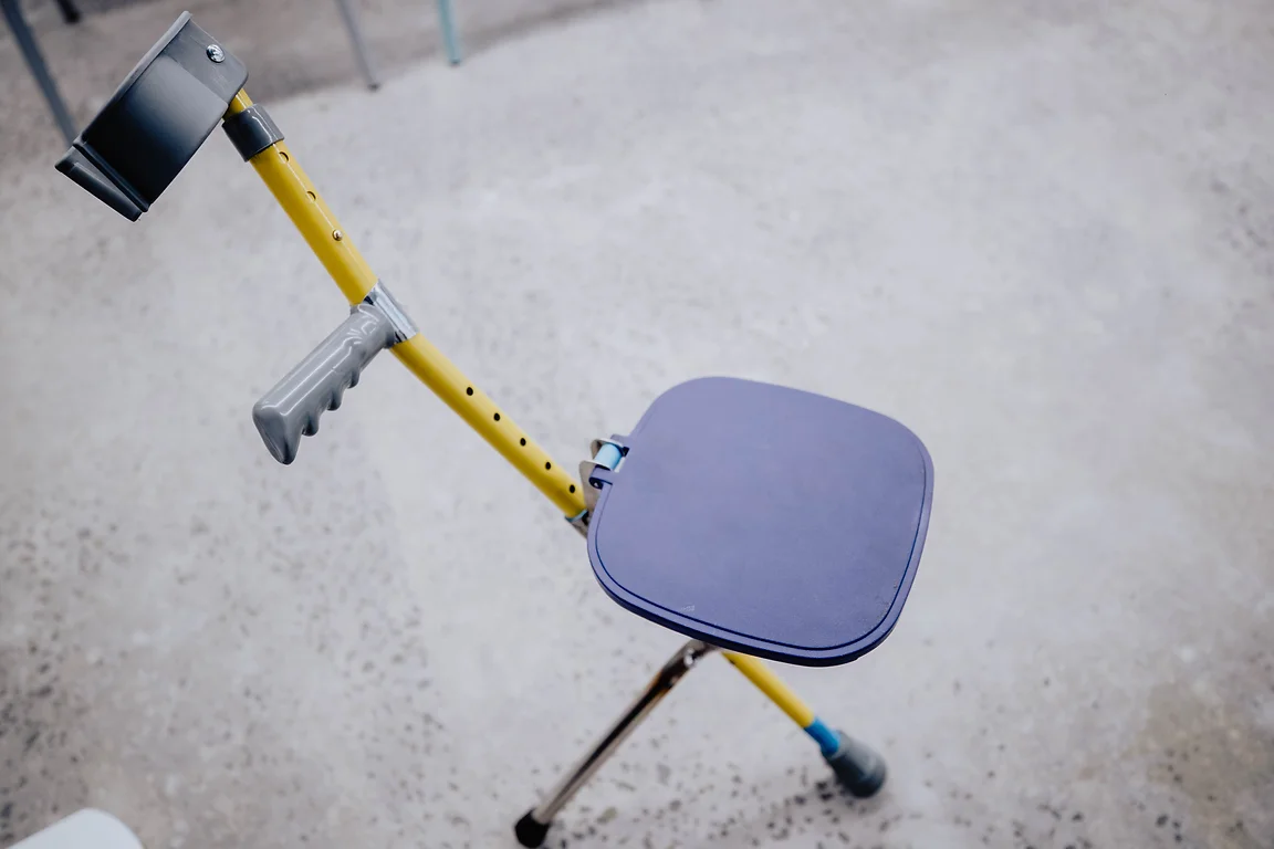 Lana’s team adapted a tripod seat walking stick to create a stool that turns into a crutch when folded. This solution utilises Lana’s existing crutches.